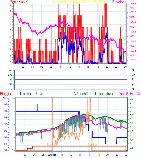 Velocità massima di raffica = 9.3 km/h da 180°( S ) giorno 03 tempo 20:02