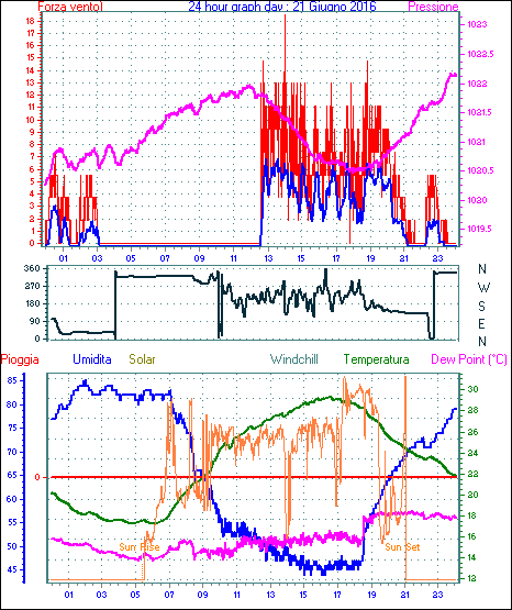 Il massimo windspeed = 25.9 kmh from 270°( W ) giorno 17 tempo 12:53