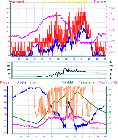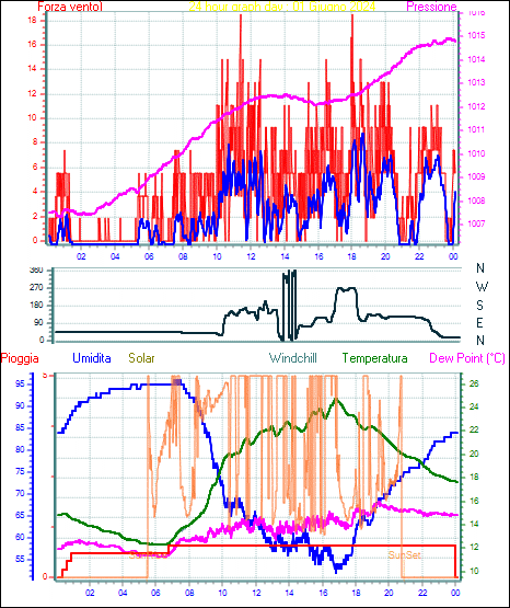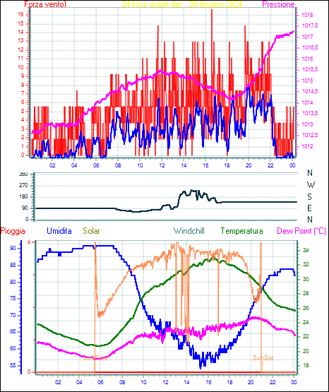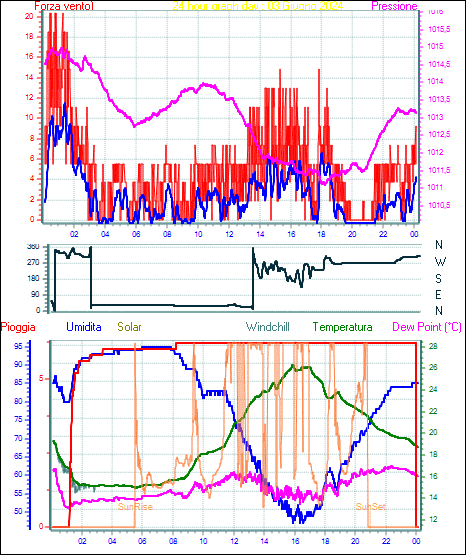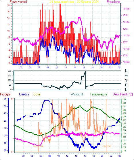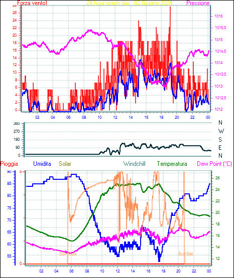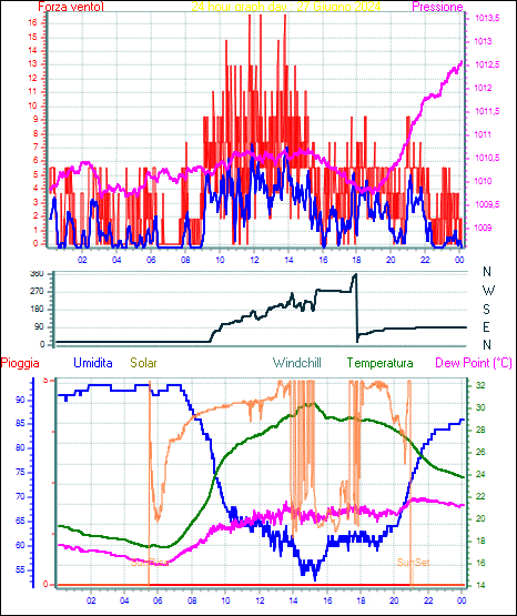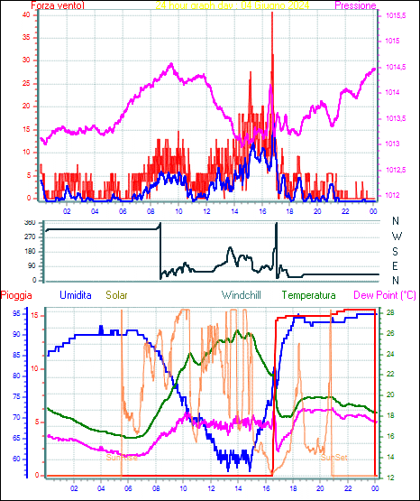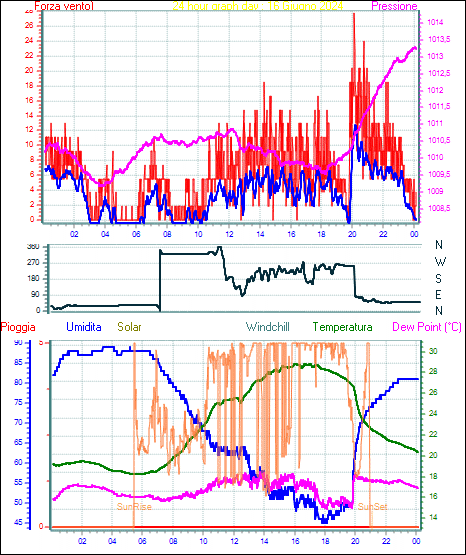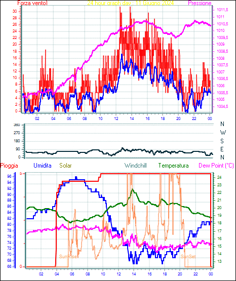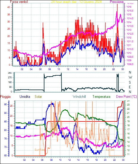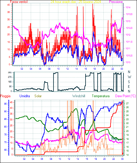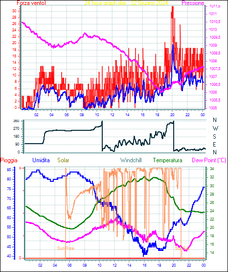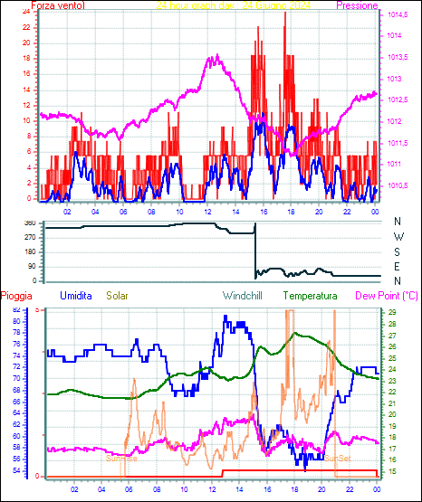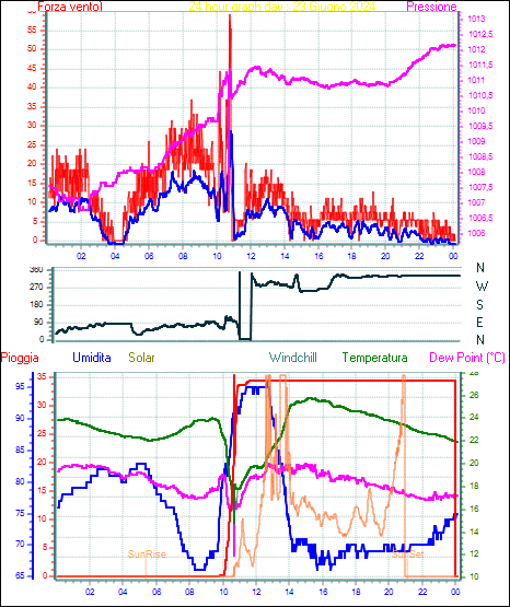 Il massimo windspeed = 44.4 kmh from 011°( N ) giorno 23 tempo 10:51