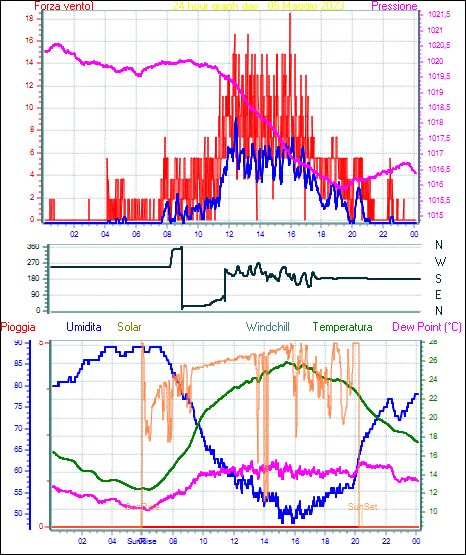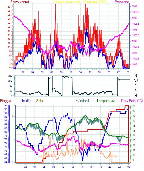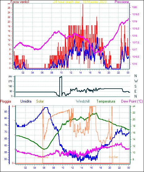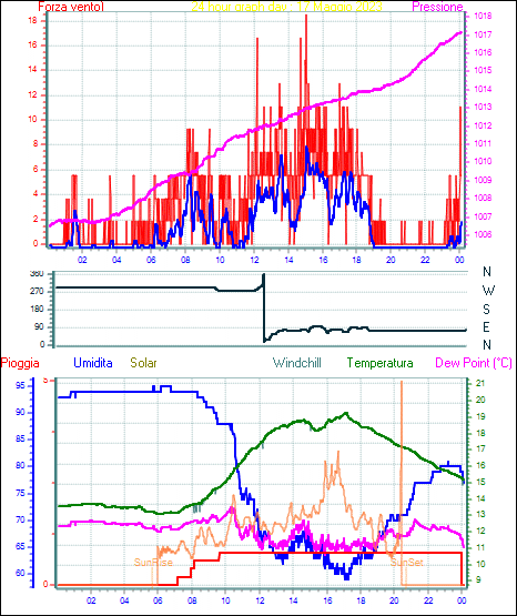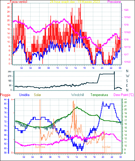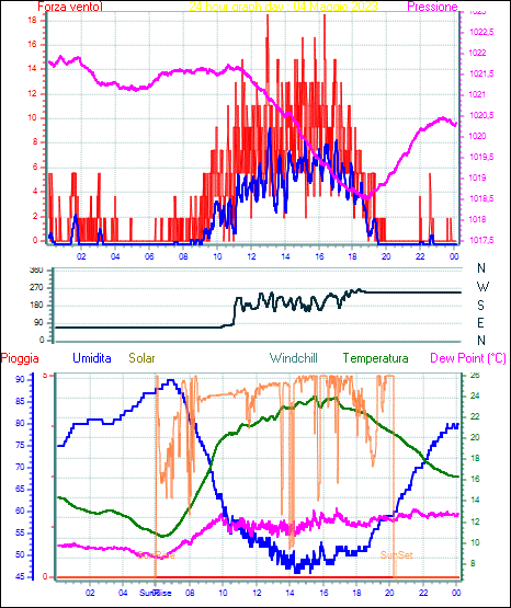 Velocità massima di raffica = 18.5 km/h da 254°(WSW) giorno 04 tempo 16:22