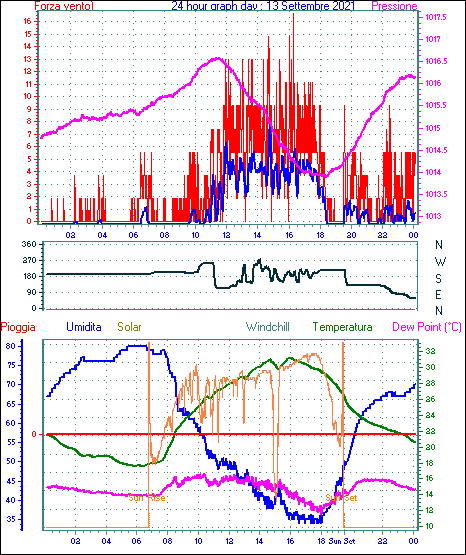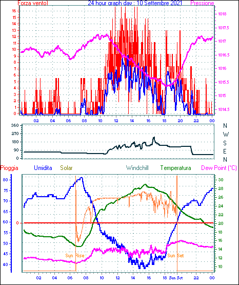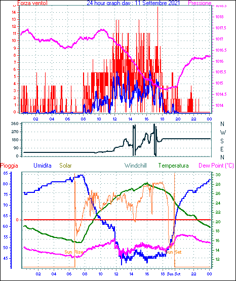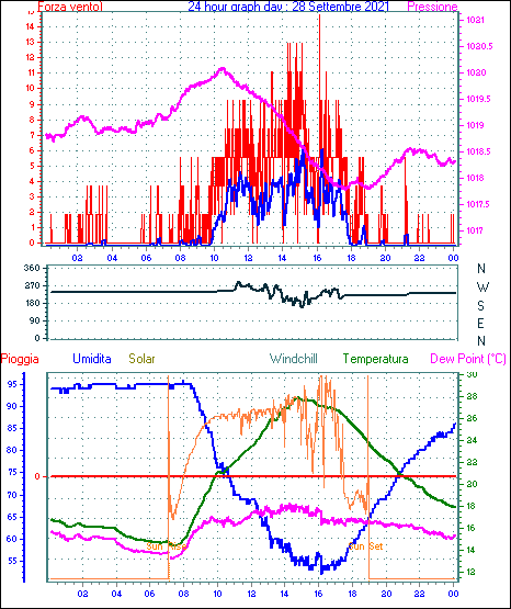 Velocità massima di raffica = 16.6 km/h da 203°(SSW) giorno 29 tempo 15:56
