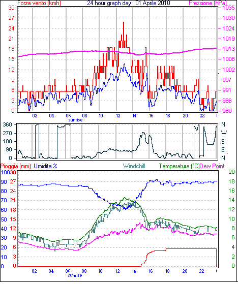 Velocità massima di raffica = 25.9 km/h da 090°( E ) giorno 01 tempo 12:54