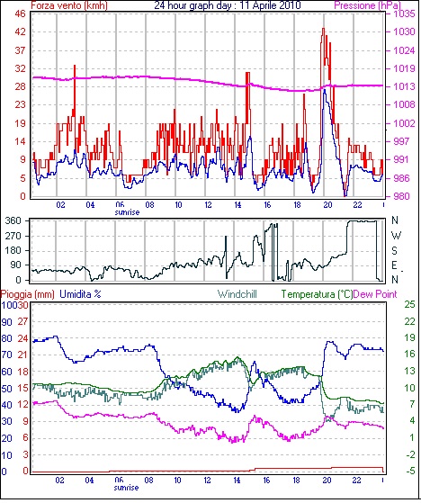 Velocità massima di raffica = 46.3 km/h from 090°( E ) giorno 11 tempo 20:01