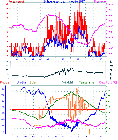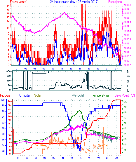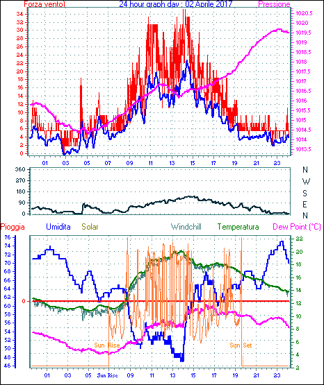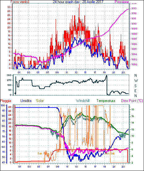 Il massimo windspeed = 27.8 kmh from 135°( SE) giorno 02 tempo 14:18