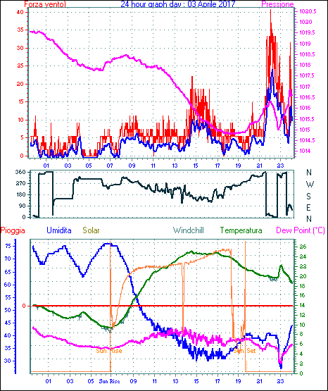 Velocità massima di raffica = 35.2 km/h da 135°( SE) giorno 02 tempo 14:17