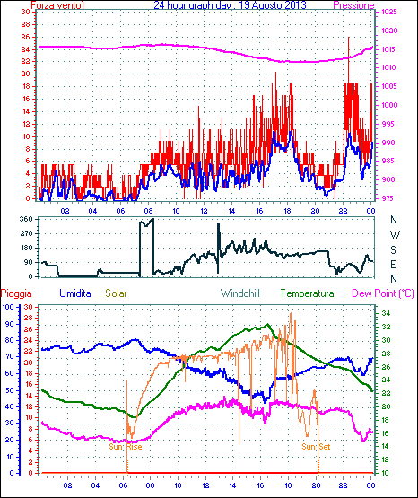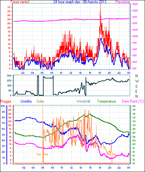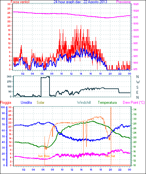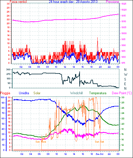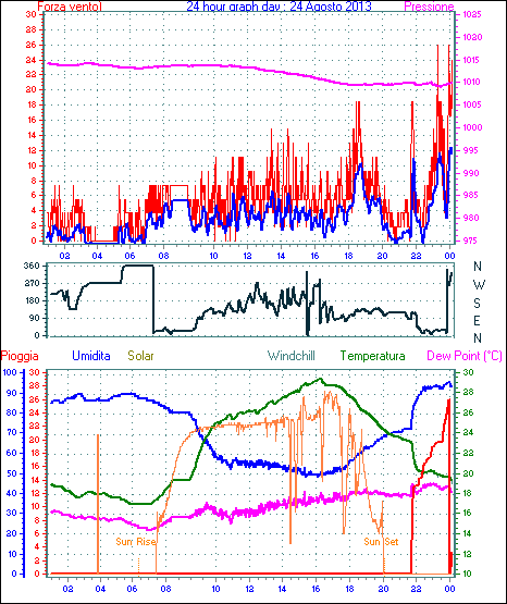 Il massimo windspeed = 24.1 kmh from 158°(SSE) giorno 27 tempo 22:03