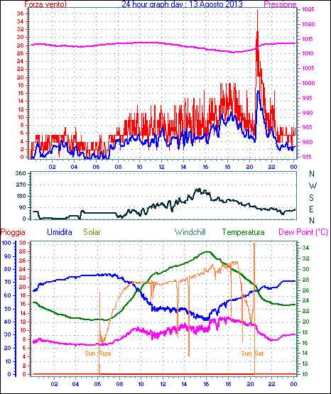 Velocità massima di raffica = 37.0 km/h from 068°(ENE) giorno 13 tempo 20:40