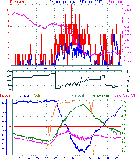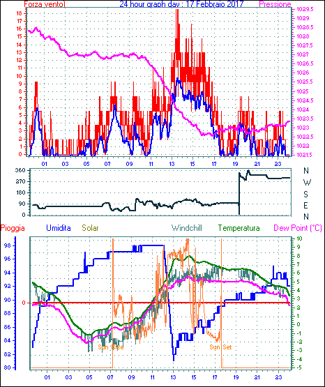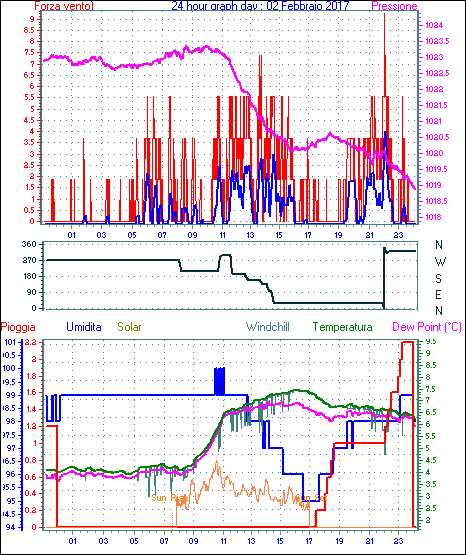 Velocità massima di raffica = 9.3 km/h da 315°( NW) giorno 02 tempo 22:02