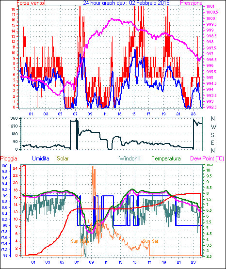 Velocità massima di raffica = 16.6 km/h da 045°( NE) giorno 01 tempo 23:27