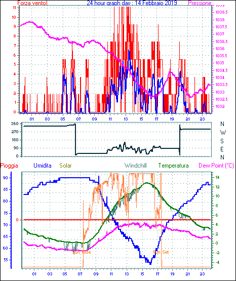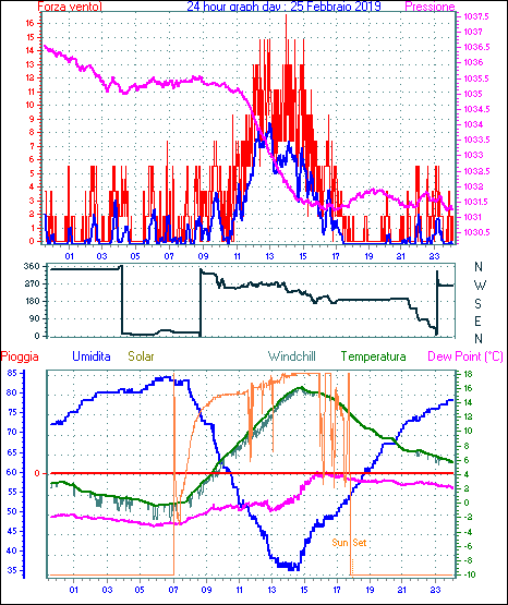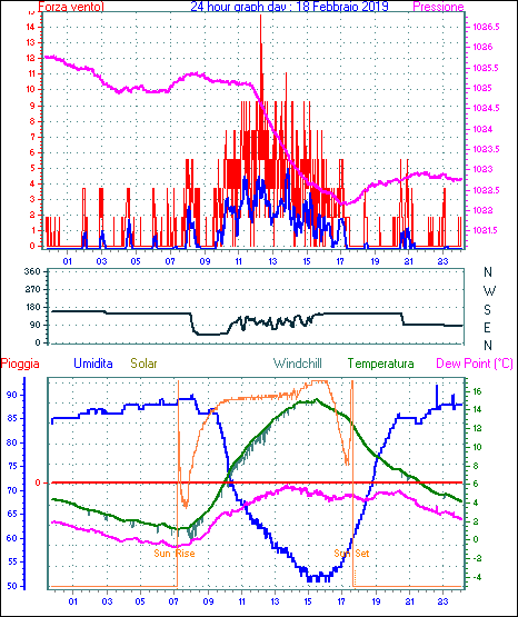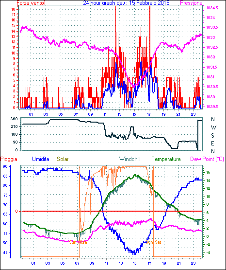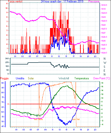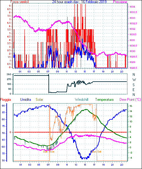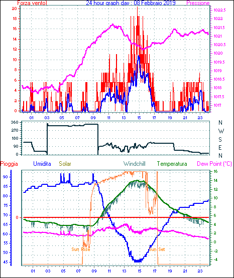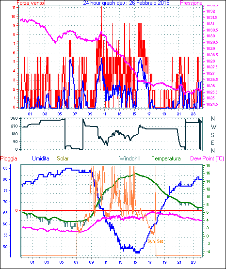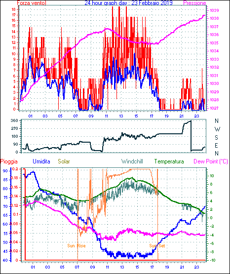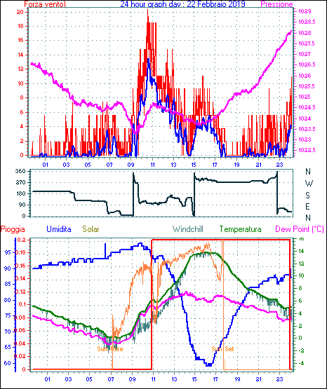 Il massimo windspeed = 16.6 kmh from 113°(ESE) giorno 22 tempo 10:35