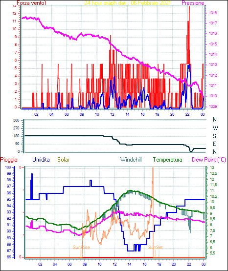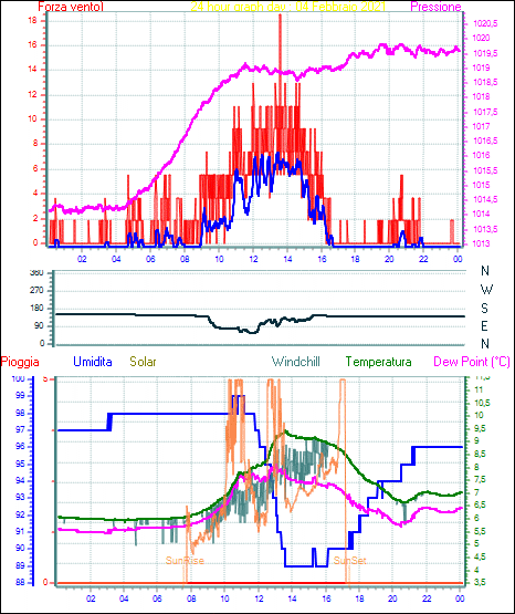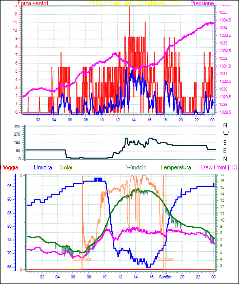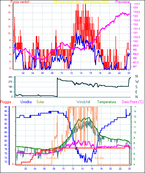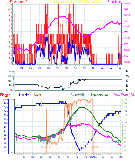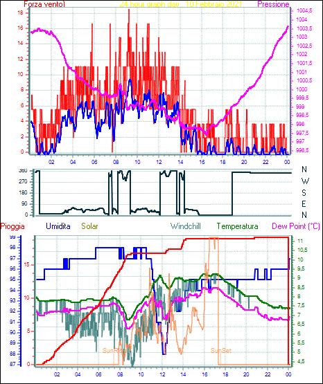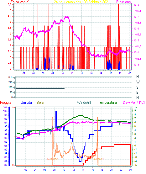 Velocità massima di raffica = 5.6 km/h da 152°(SSE) giorno 03 tempo 21:44