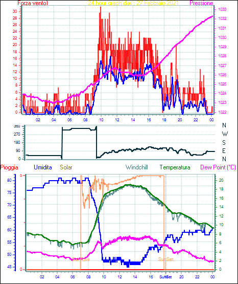 Velocità massima di raffica = 31.5 km/h da 082°( E ) giorno 27 tempo 09:56