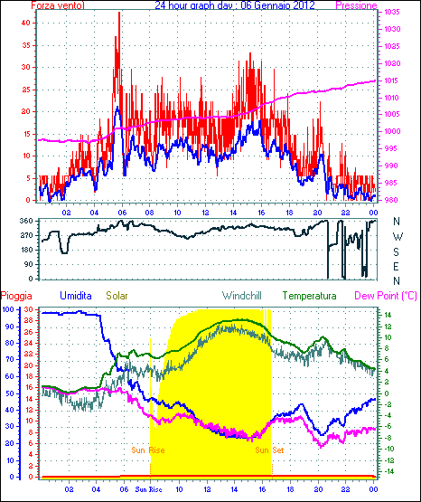 Velocità massima di raffica = 42.6 km/h from 00°( N ) giorno 06 tempo 05:47