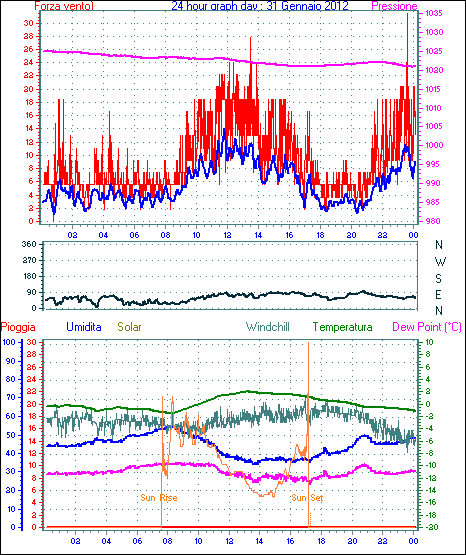 Velocità massima di raffica = 31.5 km/h da 068°(ENE) giorno 31 tempo 23:36