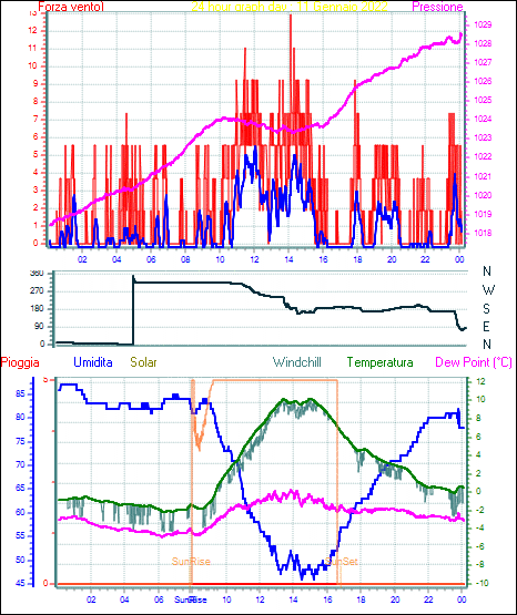 Velocità massima di raffica = 11.1 km/h da 303°(WNW) giorno 03 tempo 03:47