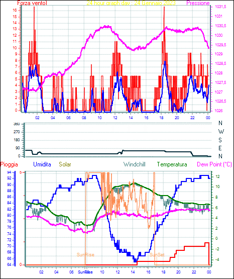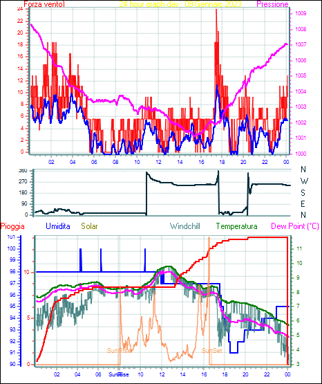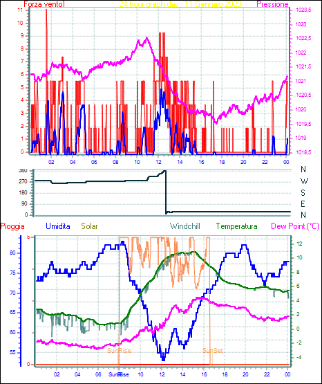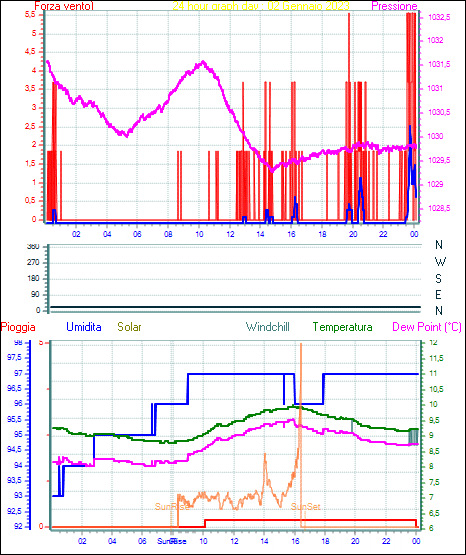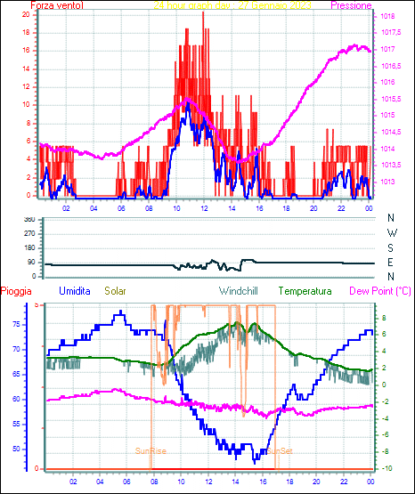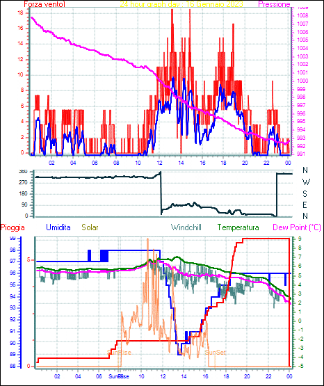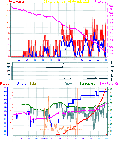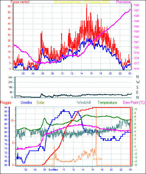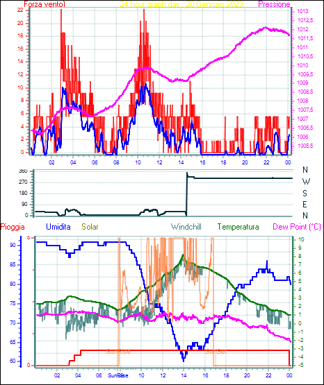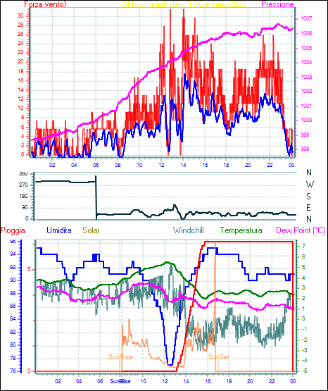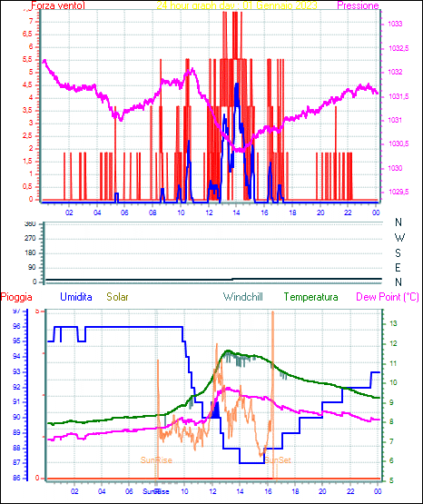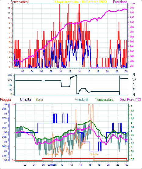 Il massimo windspeed = 33.3 kmh from 060°(ENE) giorno 23 tempo 17:30