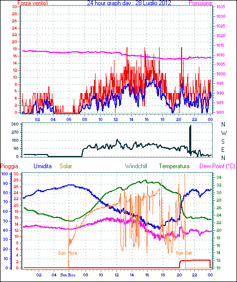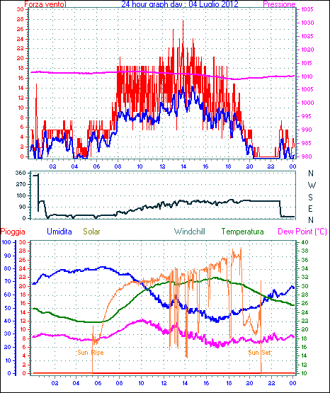 Velocità massima di raffica = 27.8 km/h da 135°( SE) giorno 04 tempo 13:53