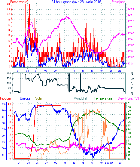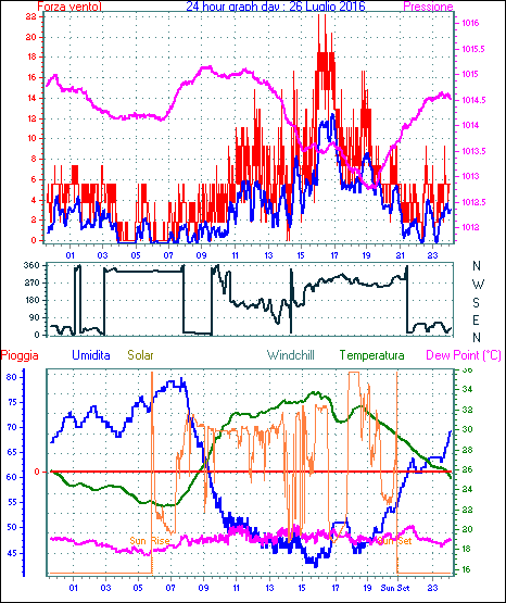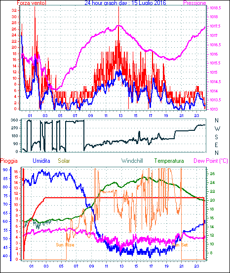 Il massimo windspeed = 25.9 kmh from 023°(NNE) giorno 14 tempo 23:51