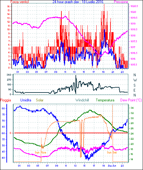 Velocità massima di raffica = 18.5 km/h da 135°( SE) giorno 04 tempo 16:46