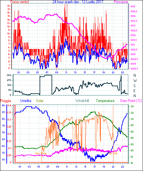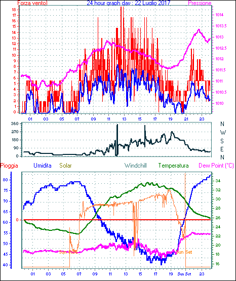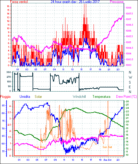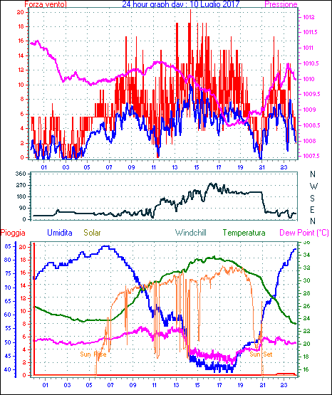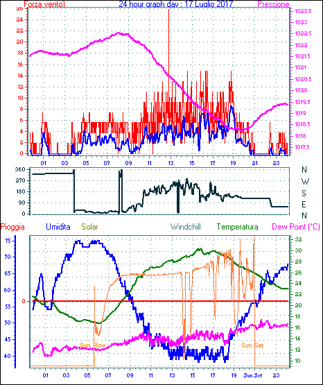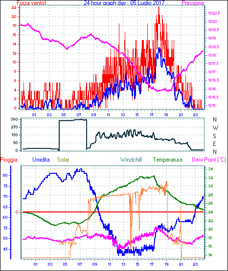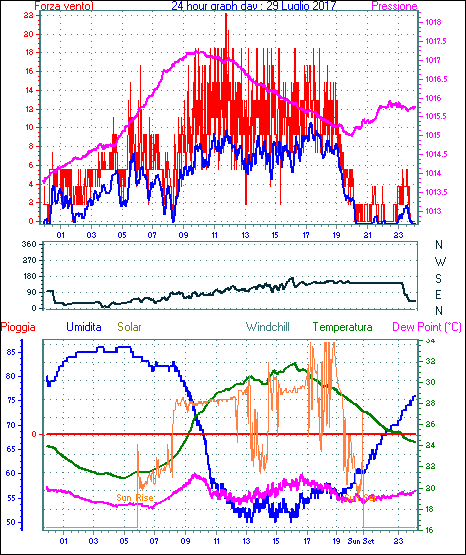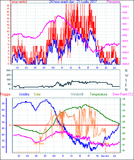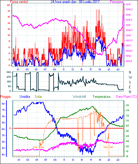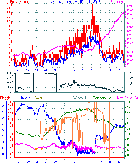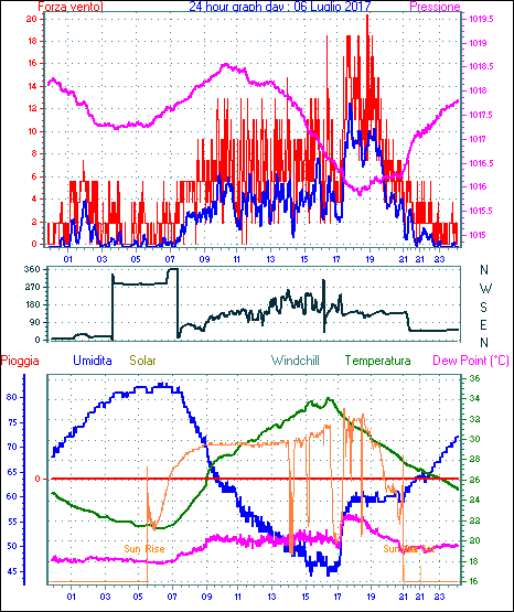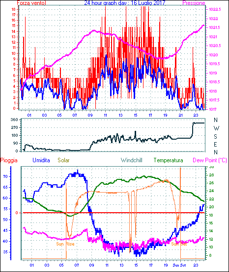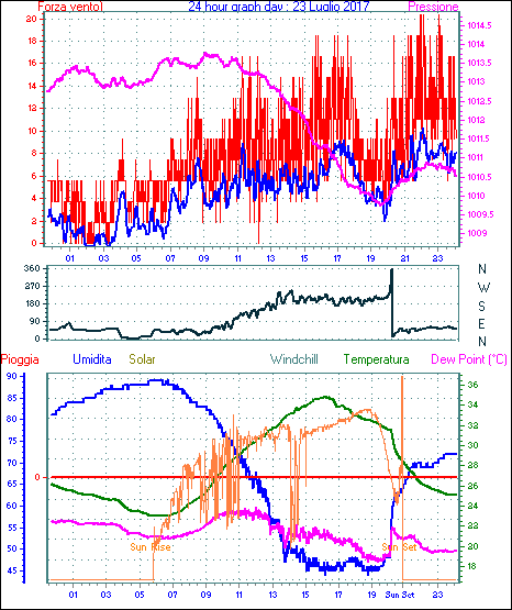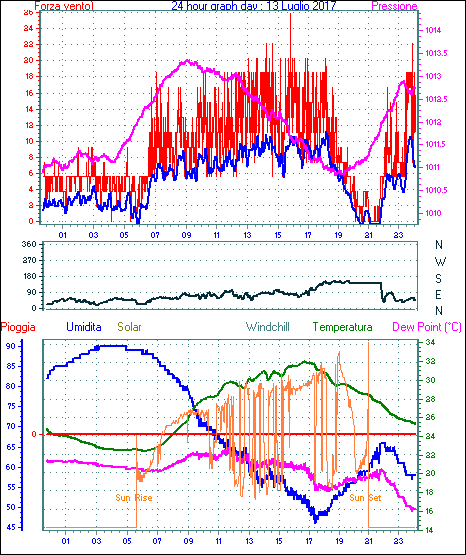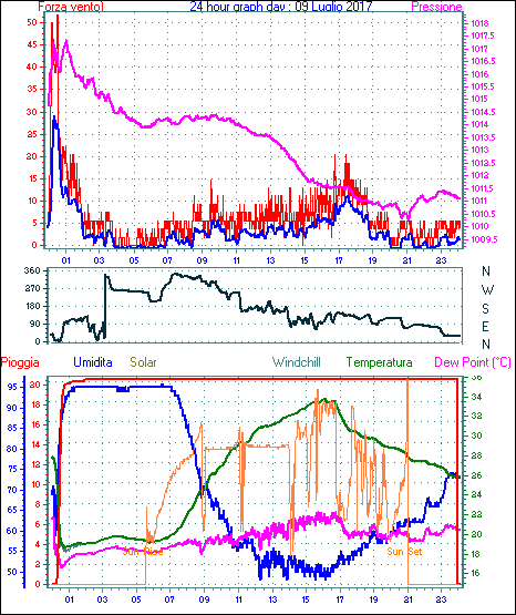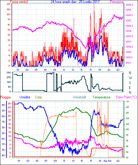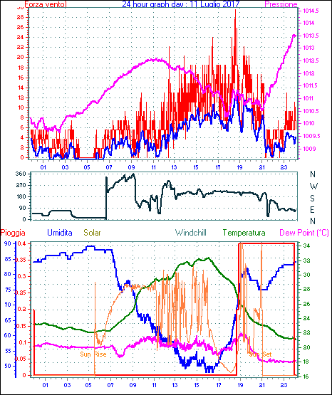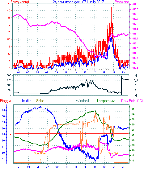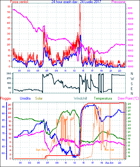 Il massimo windspeed = 35.2 kmh from 315°( NW) giorno 24 tempo 14:20