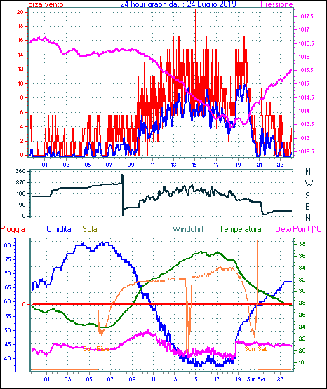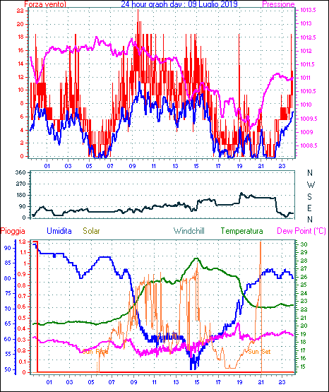Velocità massima di raffica = 24.1 km/h da 023°(NNE) giorno 02 tempo 21:44