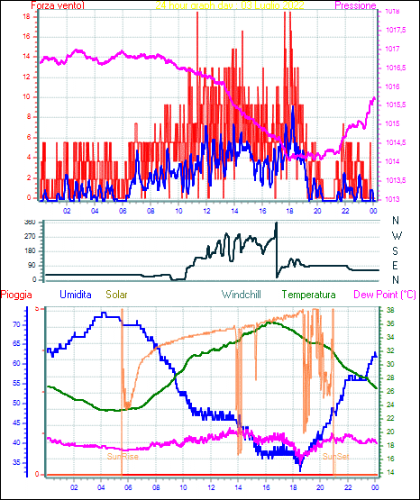 Velocità massima di raffica = 18.5 km/h da 123°(ESE) giorno 03 tempo 18:05