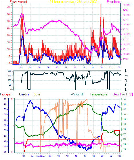 Velocità massima di raffica = 44.4 km/h from 225°( SW) giorno 29 tempo 19:43