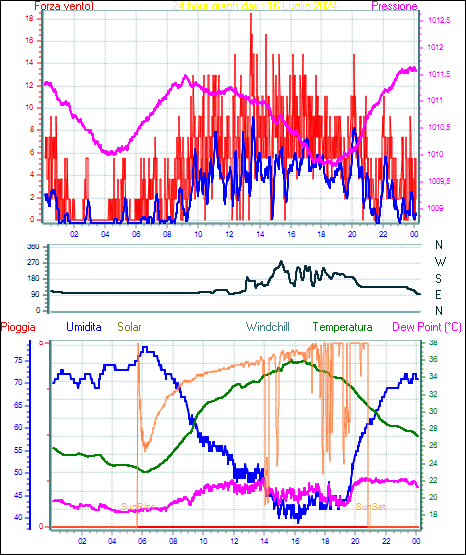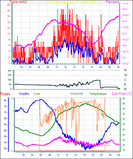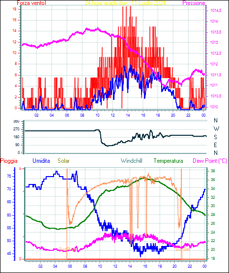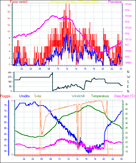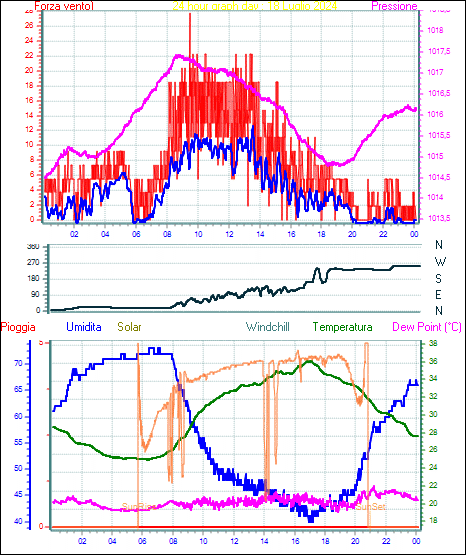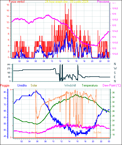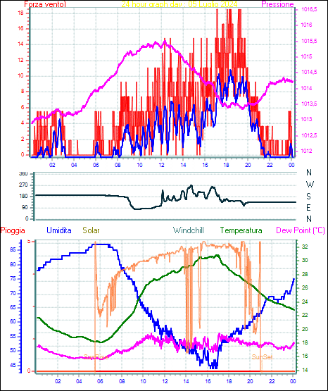Velocità massima di raffica = 18.5 km/h da 152°(SSE) giorno 02 tempo 17:02