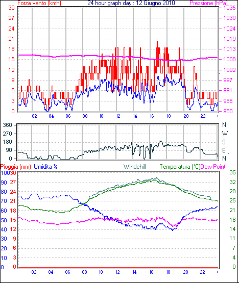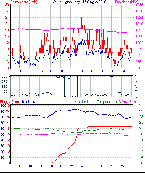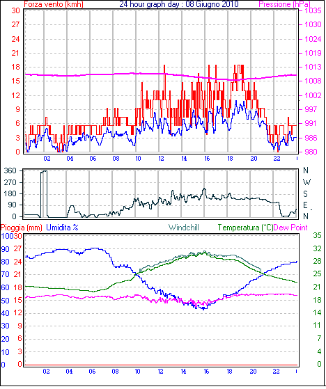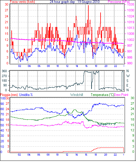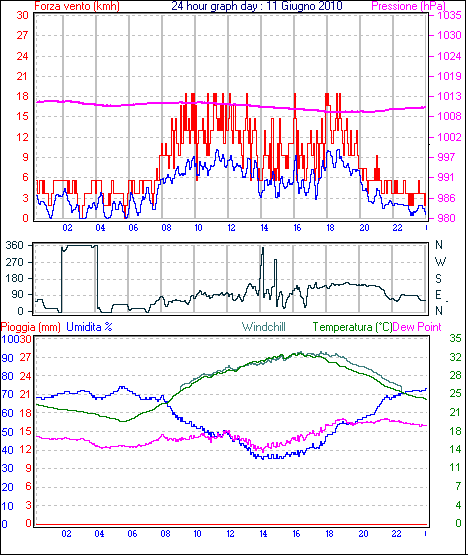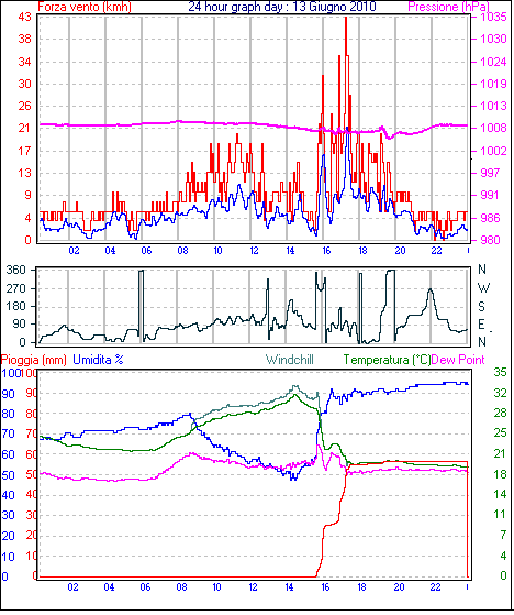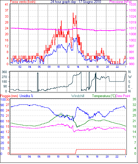 Il massimo windspeed = 33.3 kmh from 113°(ESE) giorno 13 tempo 17:16