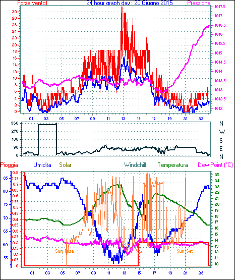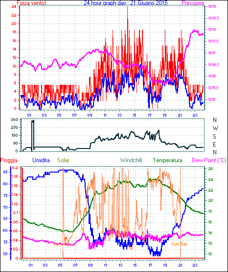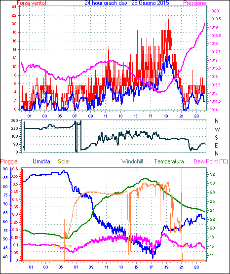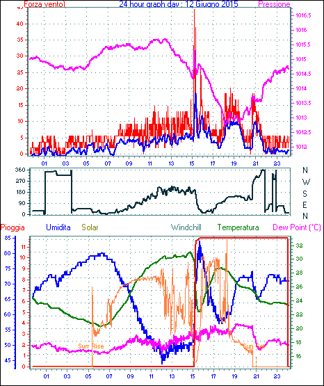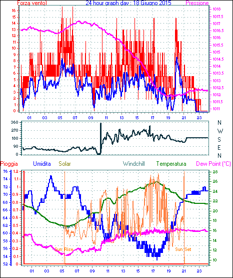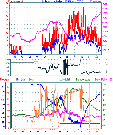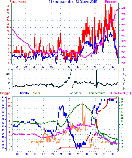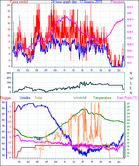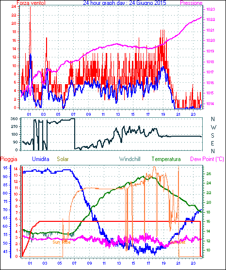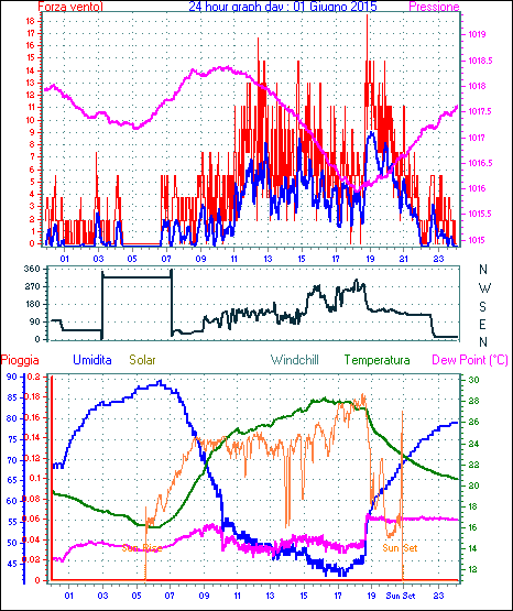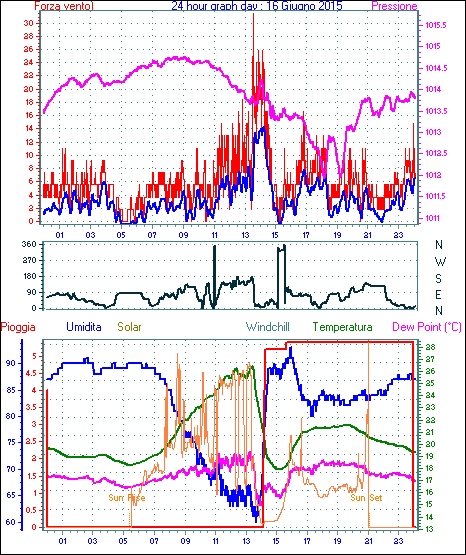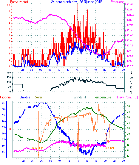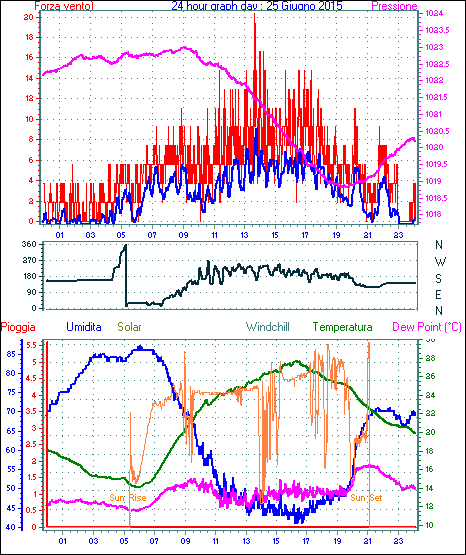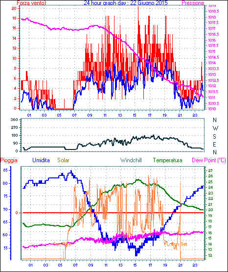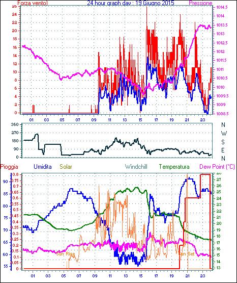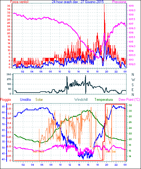 Il massimo windspeed = 25.9 kmh from 045°( NE) giorno 27 tempo 19:33