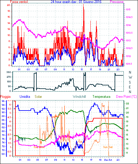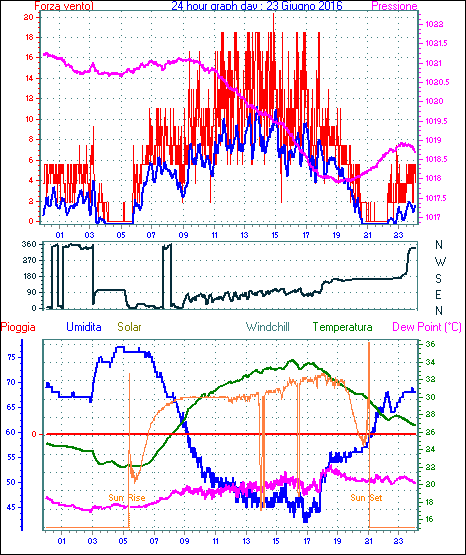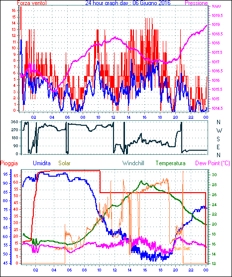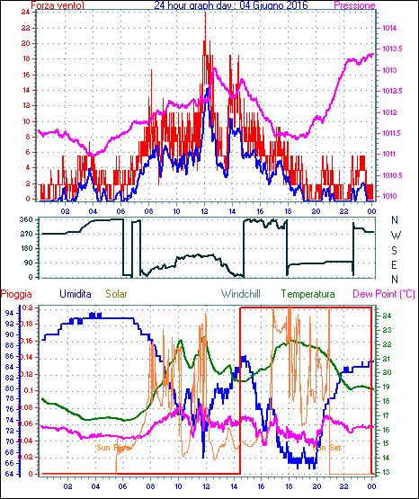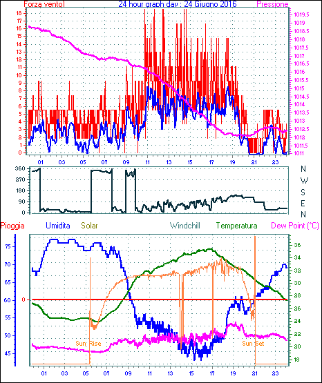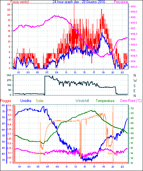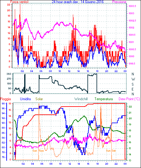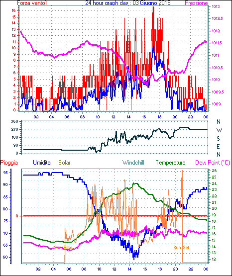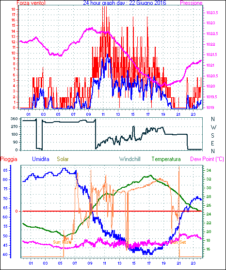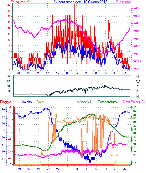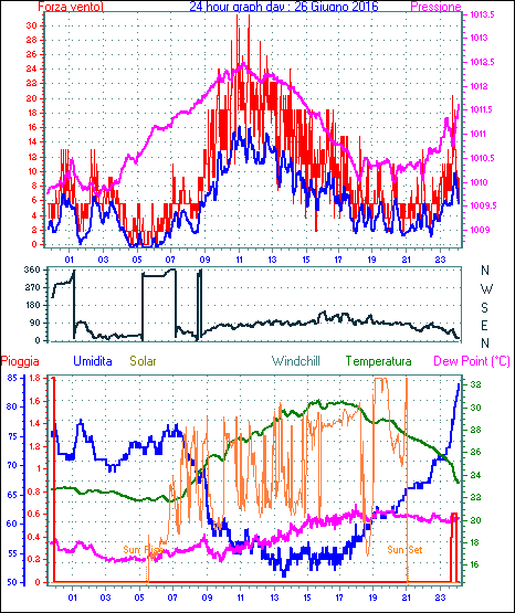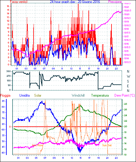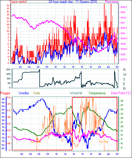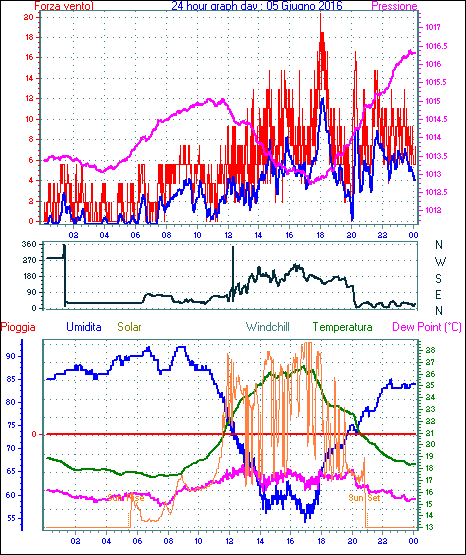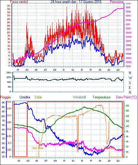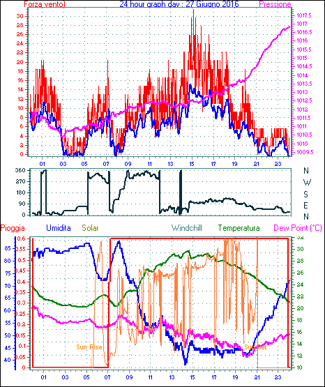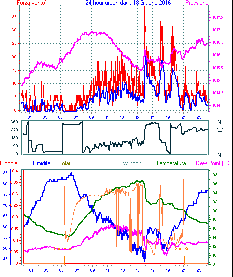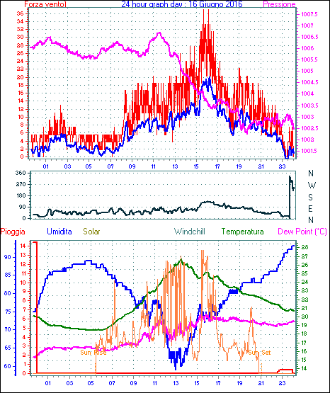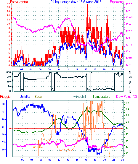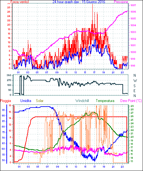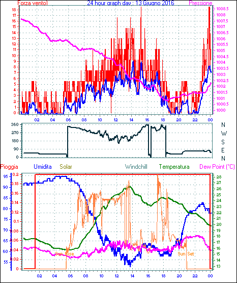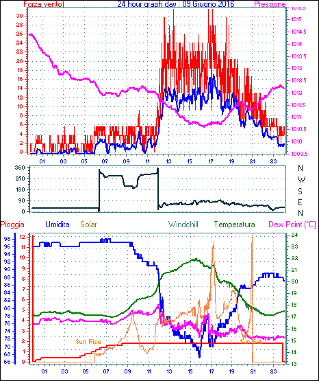 Il massimo windspeed = 25.9 kmh from 270°( W ) giorno 17 tempo 12:53