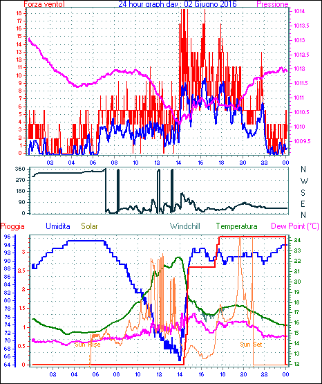 Velocità massima di raffica = 18.5 km/h da 023°(NNE) giorno 02 tempo 16:25