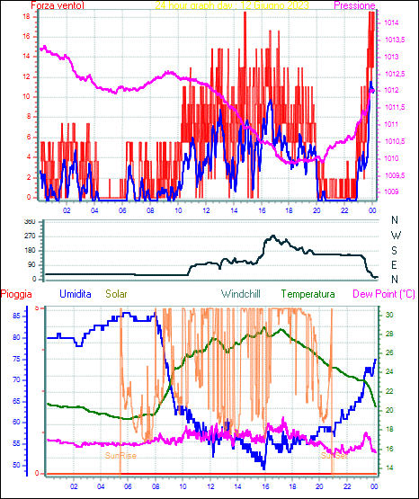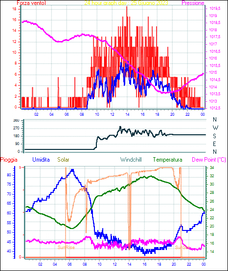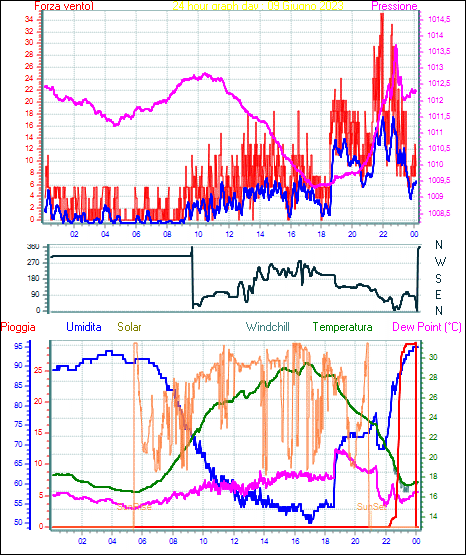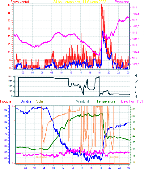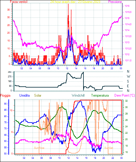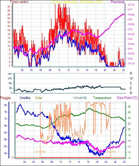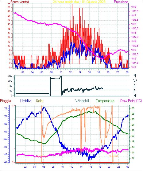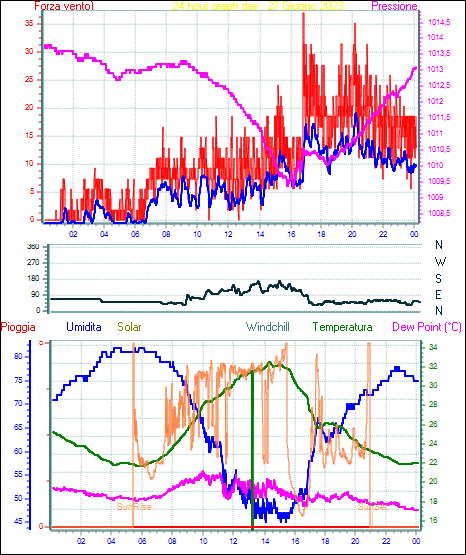 Il massimo windspeed = 29.6 kmh from 040°( NE) giorno 27 tempo 16:52