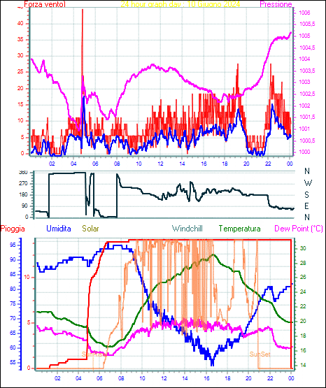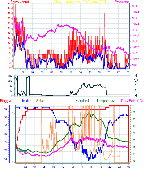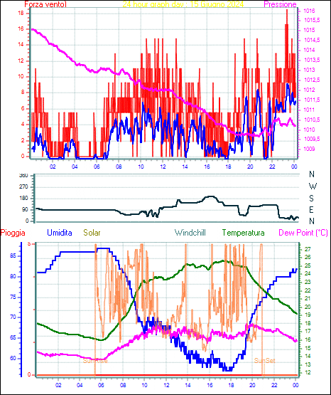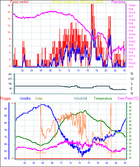Il massimo windspeed = 44.4 kmh from 011°( N ) giorno 23 tempo 10:51