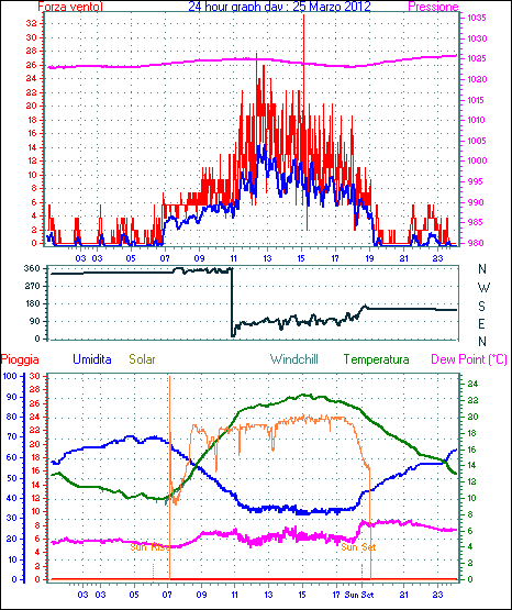 Velocità massima di raffica = 33.3 km/h from 068°(ENE) giorno 25 tempo 15:08