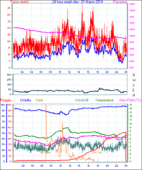 Velocità massima di raffica = 48.1 km/h from 090°( E ) giorno 01 tempo 14:43
