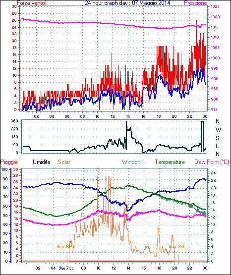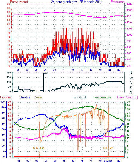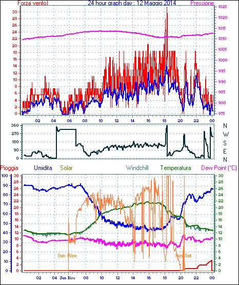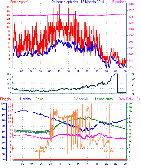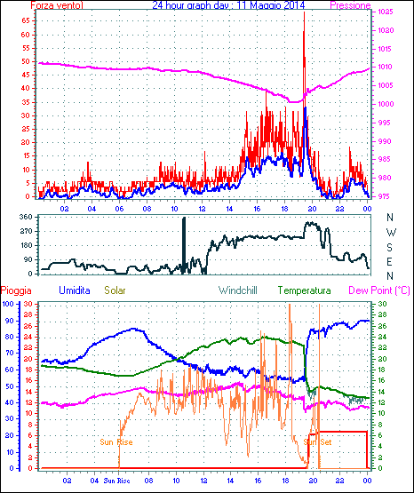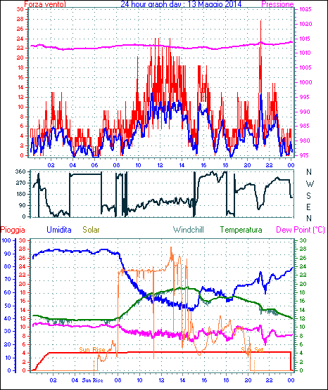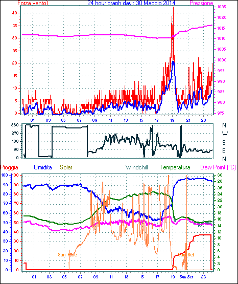 Il massimo windspeed = 44.4 kmh from 338°(NNW) giorno 11 tempo 19:24