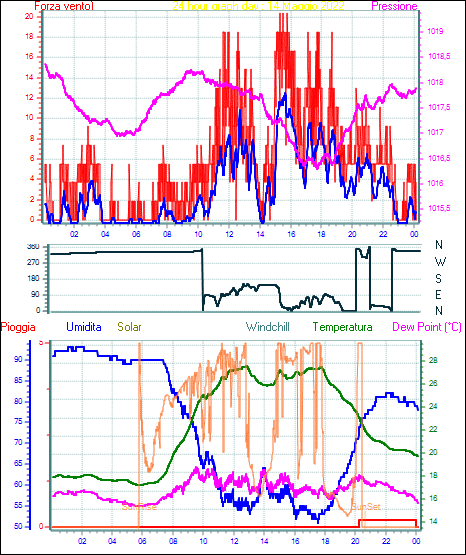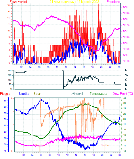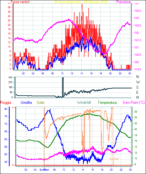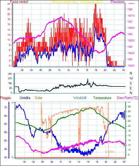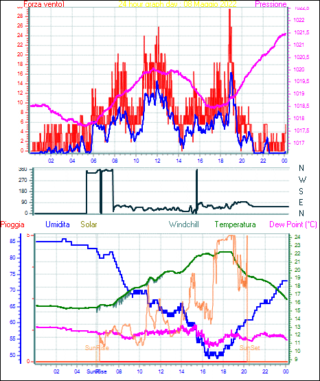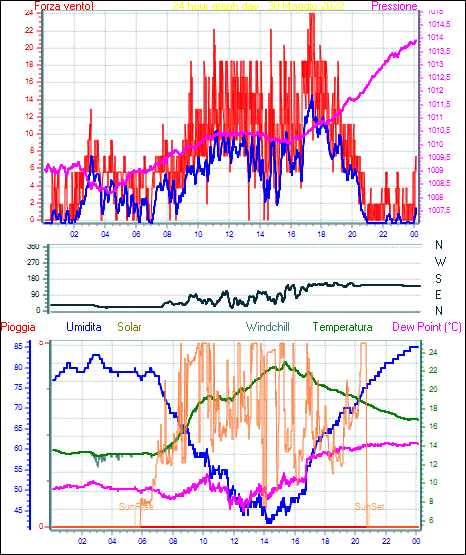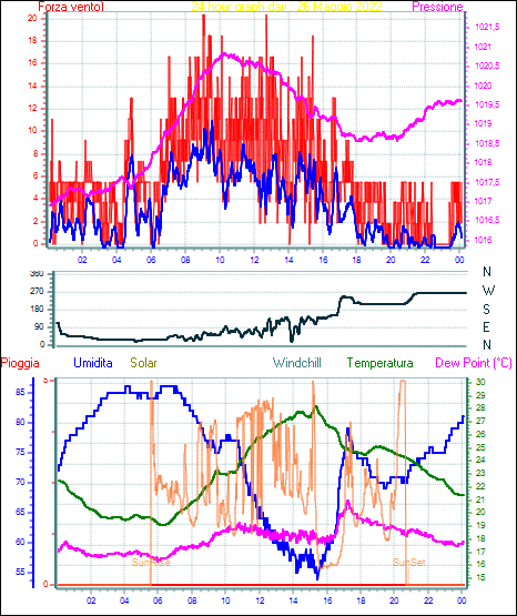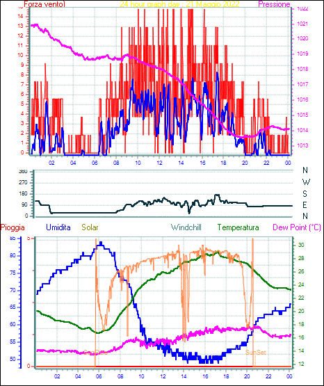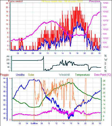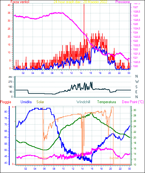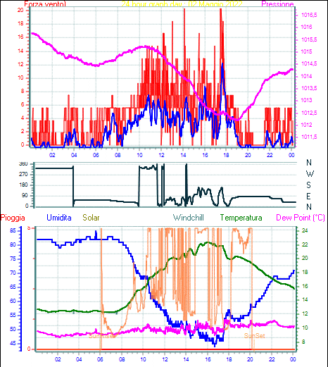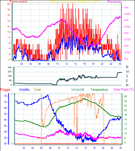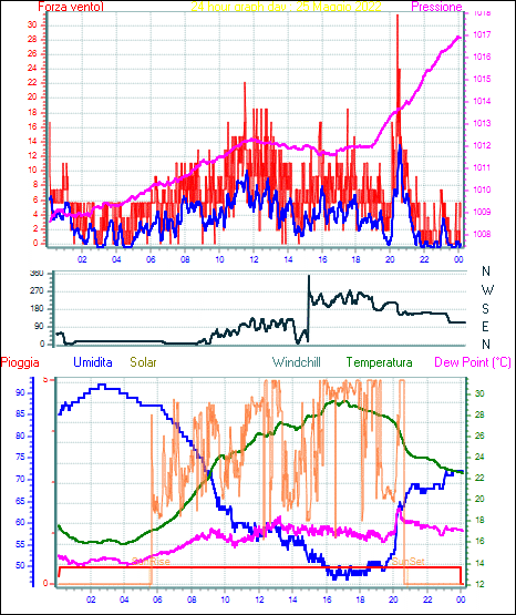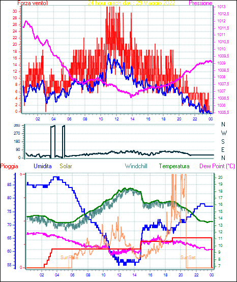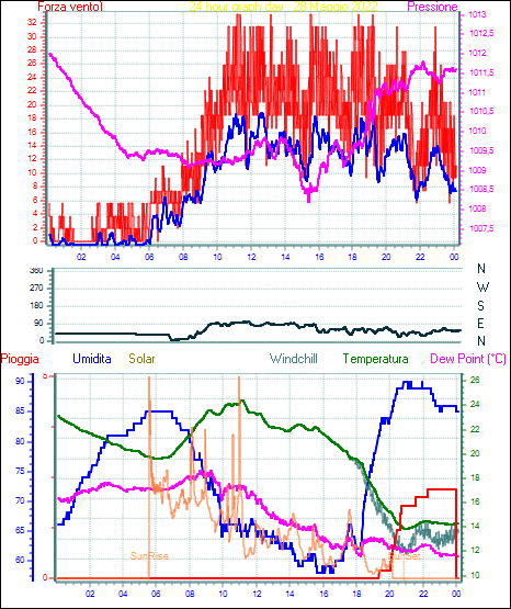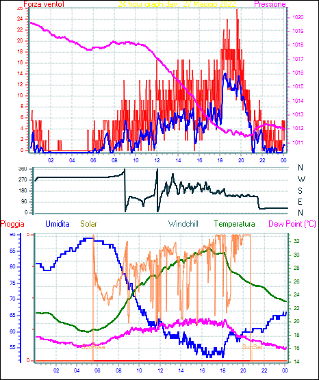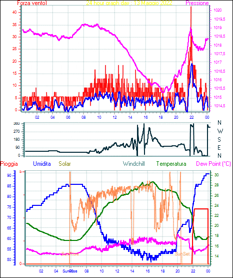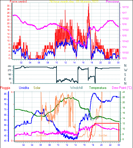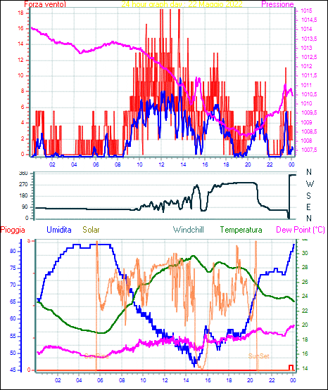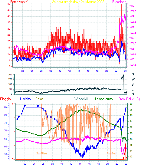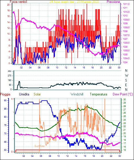 Il massimo windspeed = 35.2 kmh from 300°(WNW) giorno 24 tempo 23:06