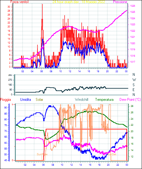 Velocità massima di raffica = 20.4 km/h da 128°( SE) giorno 03 tempo 13:26