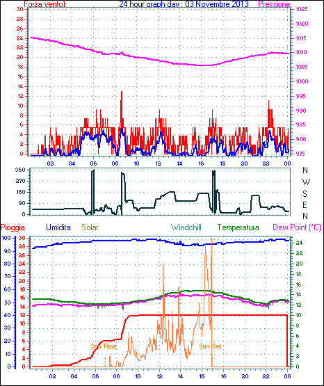 Velocità massima di raffica = 13.0 km/h da 315°( NW) giorno 03 tempo 08:36