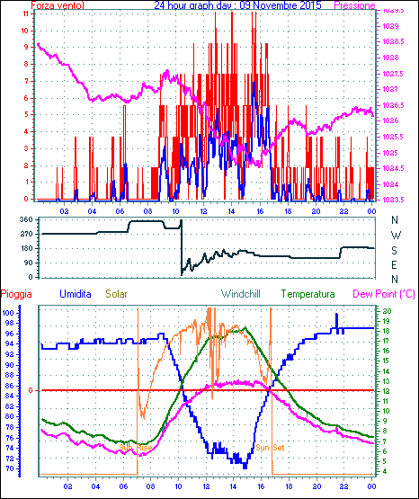 Velocità massima di raffica = 9.3 km/h da 203°(SSW) giorno 03 tempo 13:54