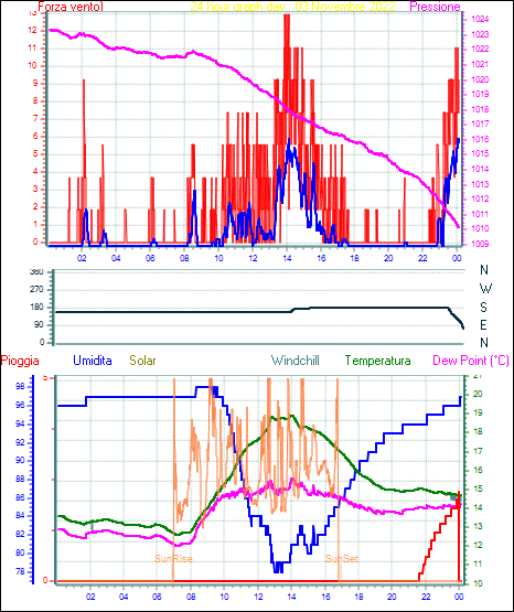 Il massimo windspeed = 31.5 kmh from 053°( NE) giorno 22 tempo 11:39