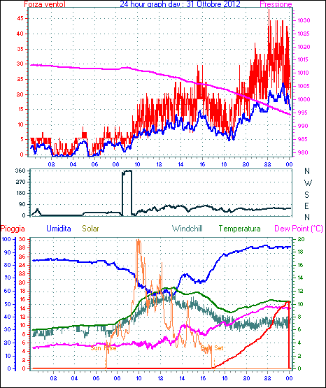Il massimo windspeed = 31.5 kmh from 068°(ENE) giorno 31 tempo 23:23