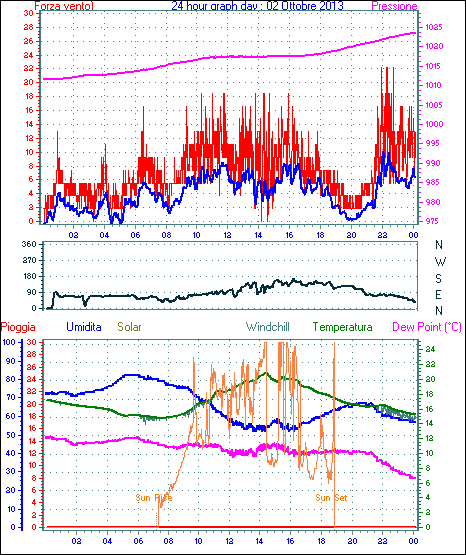 Velocità massima di raffica = 22.2 km/h da 068°(ENE) giorno 02 tempo 22:41