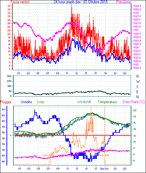 Velocità massima di raffica = 37.0 km/h from 045°( NE) giorno 01 tempo 11:59