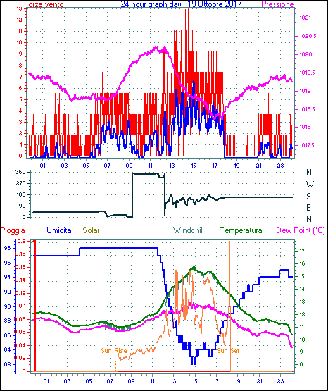 Velocità massima di raffica = 18.5 km/h da 113°(ESE) giorno 04 tempo 13:39
