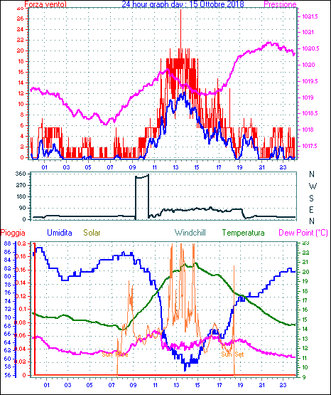 Velocità massima di raffica = 20.4 km/h da 360°( N ) giorno 01 tempo 19:36