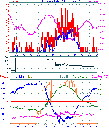 Velocità massima di raffica = 18.5 km/h da 113°(ESE) giorno 02 tempo 10:53
