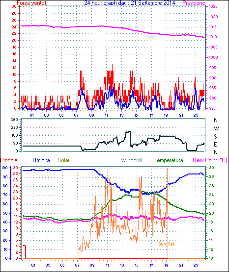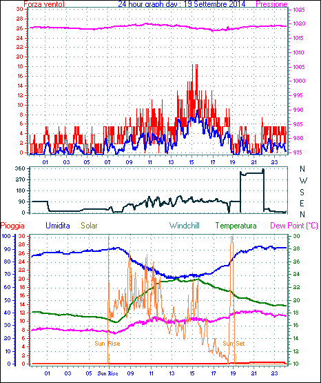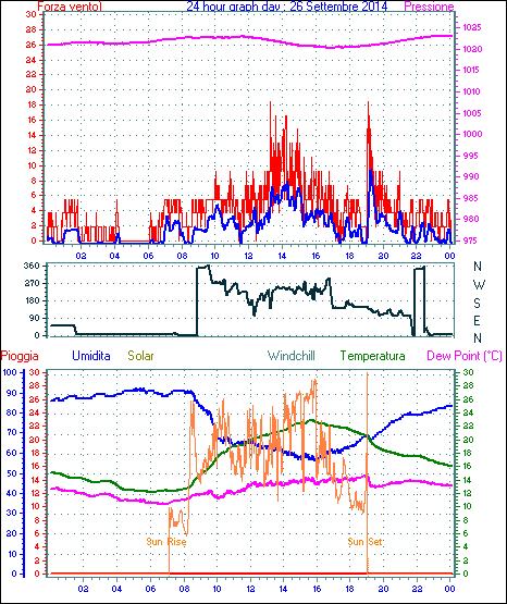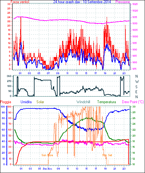 Il massimo windspeed = 25.9 kmh from 090°( E ) giorno 22 tempo 22:01