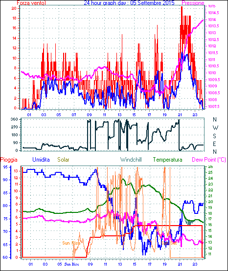 Il massimo windspeed = 38.9 kmh from 135°( SE) giorno 04 tempo 19:55